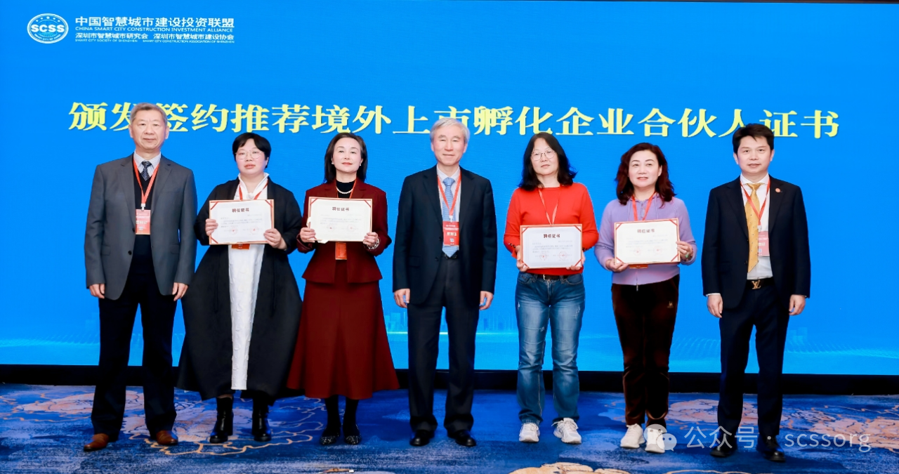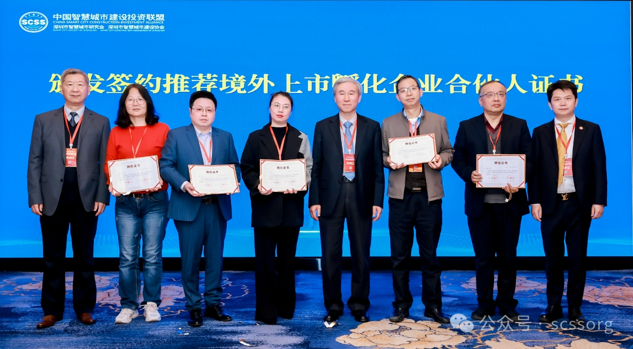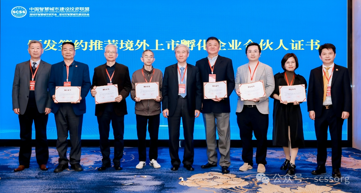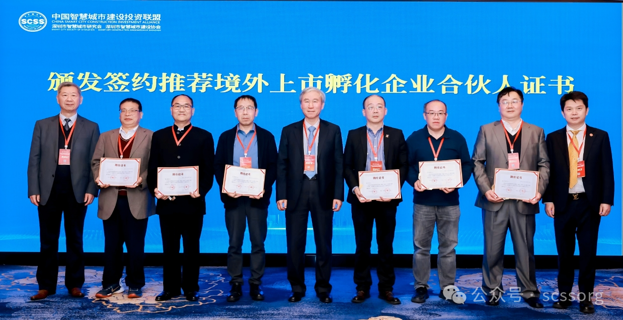 主题分享之后,全国工程勘察设计大师\中国智慧城市建设投资联盟主席\深圳市智慧城市研究会会长\首席科学家陈宜言教授、中智联执行主席张晓新教授和中智联总秘书长\执行会长\傲盛(深圳)企业孵化有限公司孙志光董事长,共同为32位已签约的推荐境外上市孵化企业合伙人颁发证书。